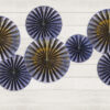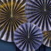 Rozety dekoracyjne, w kolorze granatowym ze złotymi wzorami, średnice po złożeniu ok. 23 cm (2 szt.), 32 cm (1 szt.) i 40 cm (1 szt.). (1 op. / 4 szt.)