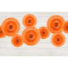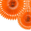 Rozety dekoracyjne wykonane z bibuły w kolorze pomarańczowym, średnice po złożeniu ok. 20 cm, 25 cm i 30 cm. Produkt wielokrotnego użytku. Montaż przy pomocy spinacza. (1 op. / 3 szt.)