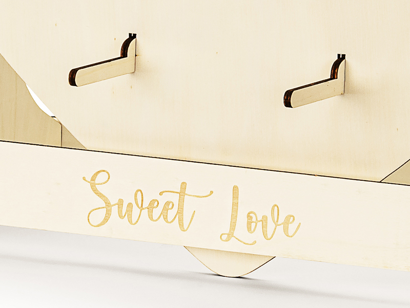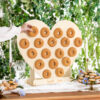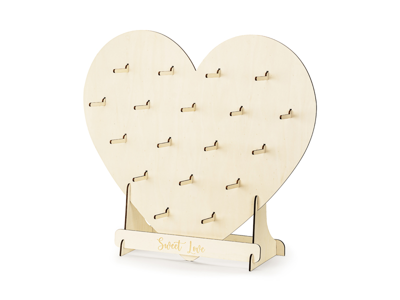 Drewniana Ściana na Donuty Serce z 18 haczykami do samodzielnego zamontowania, szerokość ok. 65 cm, wysokość ok. 59 cm.