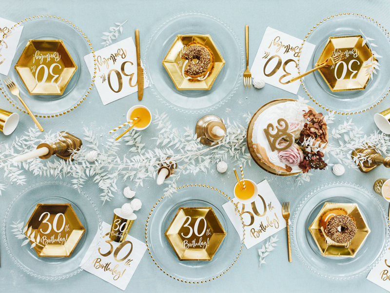 Serwetki papierowe 30th Birthday w kolorze białym ze złotym wzorem wymiary po rozłożeniu ok. 33 x 33 cm, wymiary po złożeniu ok. 16,5 x 16,5 cm. (1 op. / 20 szt.)