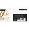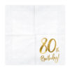 Serwetki papierowe w kolorze białym ze złotym metalizowanym napisem 80th Birthday, wymiary po rozłożeniu ok. 33 x 33 cm, wymiary po złożeniu ok. 16,5 x 16,5 cm. (1 op. / 20 szt.)