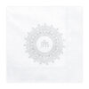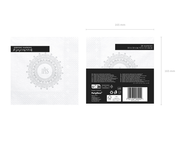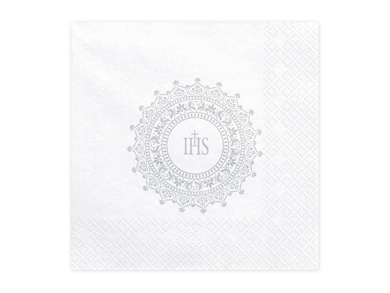 Serwetki komunijne papierowe białe ze srebrnym nadrukiem IHS, wymiary po rozłożeniu ok. 33 x 33 cm, wymiary po złożeniu ok. 16,5 x 16,5 cm. (1 op. / 20 szt.)