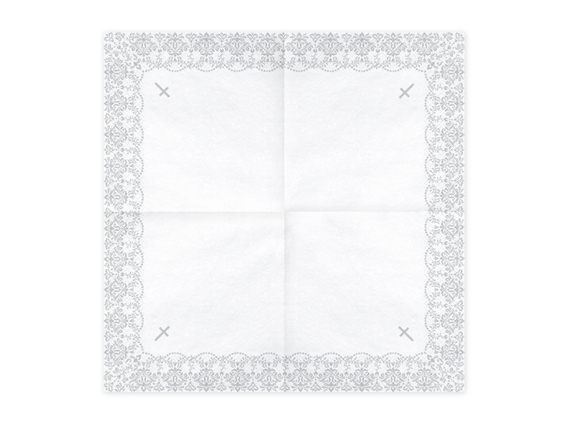 Serwetki papierowe białe ze srebrnym ornamentem, wymiary po rozłożeniu ok. 33 x 33 cm, wymiary po złożeniu ok. 16,5 x 16,5 cm. (1 op. / 20 szt.)