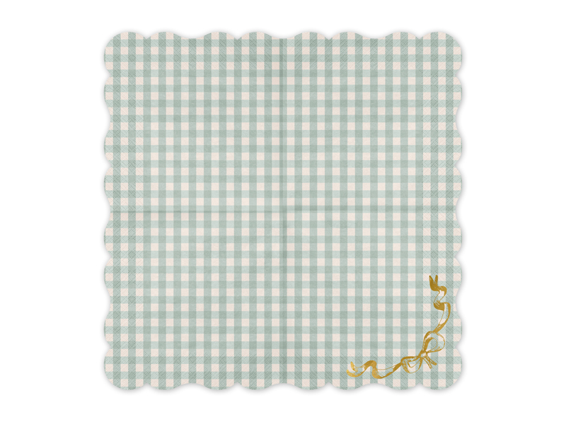 Papierowe serwetki w zieloną kratkę z błyszczącą złotą kokardką. Wymiary po rozłożeniu ok. 33 x 33 cm, wymiary po złożeniu ok. 16.5 x 16.5 cm. (1 op. / 12 szt.)