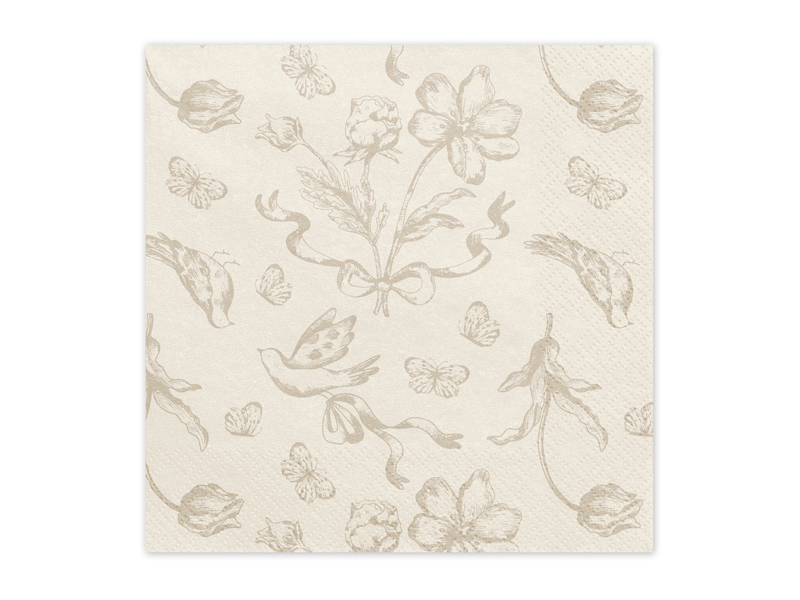 Papierowe serwetki w kolorze beżowym z ciemnobeżowymi kwiatami. Wymiary po rozłożeniu ok. 33 x 33 cm, wymiary po złożeniu ok. 16.5 x 16.5 cm. (1 op. / 12 szt.)