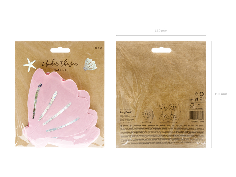 Serwetki papierowe Muszelka w kolorze różowym z opalizującym nadrukiem, wymiary po rozłożeniu ok. 26 x 25 cm, wymiary po złożeniu ok. 13 x 12,5 cm. (1 op. / 20 szt.)
