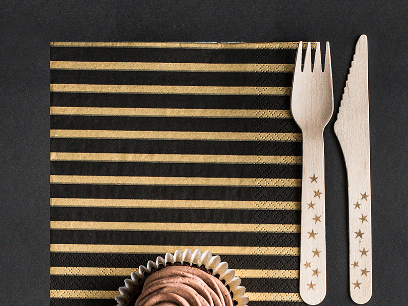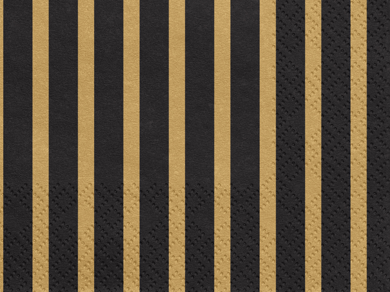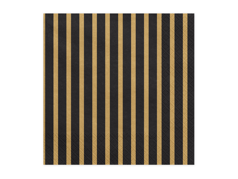 Serwetki papierowe w kolorze czarnym ze złotymi paskami, wymiary po rozłożeniu ok. 33 x 33 cm, wymiary po złożeniu ok. 16,5 x 16,5 cm. (1 op. / 20 szt.)