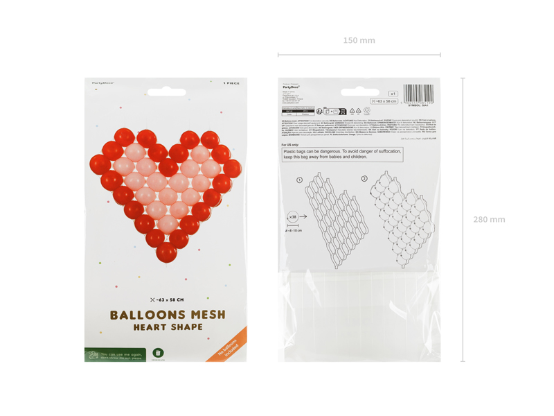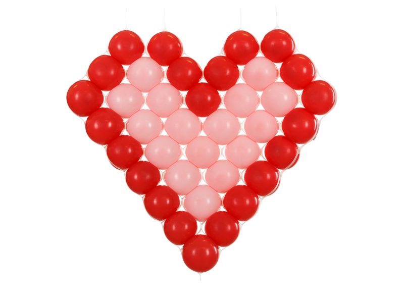 Siatka balonowa Serce wykonana z przeźroczystego plastiku. Rozmiar kształtu po wypełnieniu balonami ok. 63 x 58 cm. Siatka pomieści 38 balonów o sugerowanej średnicy 8-10 cm.
