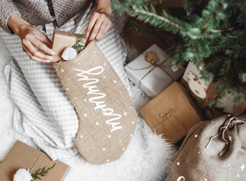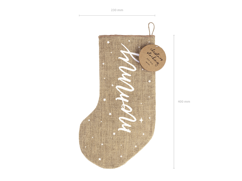 Skarpeta dekoracyjna z juty z białym nadrukiem i napisem Mommy, wymiary ok. 23 x 39.5 cm.