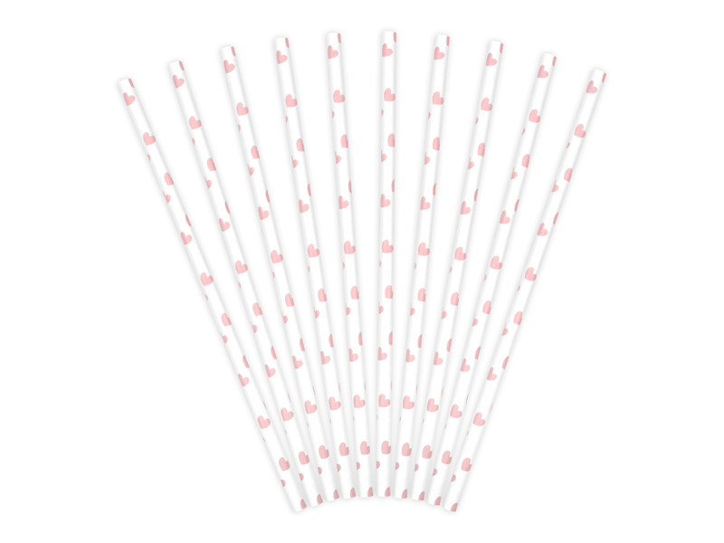 Słomki papierowe w kolorze białym z jasnoróżowymi sercami, długość około 19,5 centymetra. (1 op. / 10 szt.)