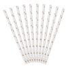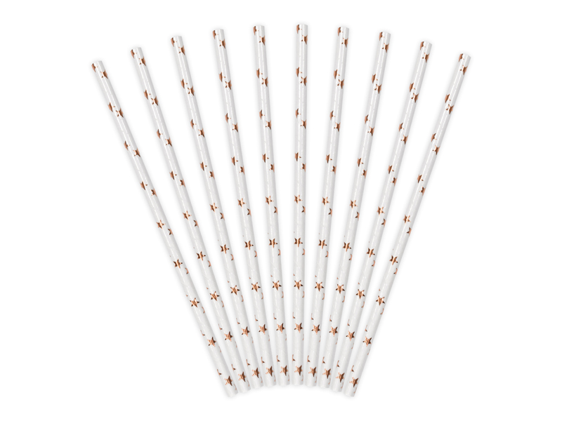 Słomki papierowe w kolorze białym, z metalizowanymi gwiazdkami w kolorze jasnego różowego złota, długość ok. 19.5 cm. Towar nie może być sprzedawany na terytorium RFN, w związku z wewnętrznymi regulacjami prawnymi Niemiec. Towar zgodny z przepisami Unii Europejskiej. (1 op. / 10 szt.)