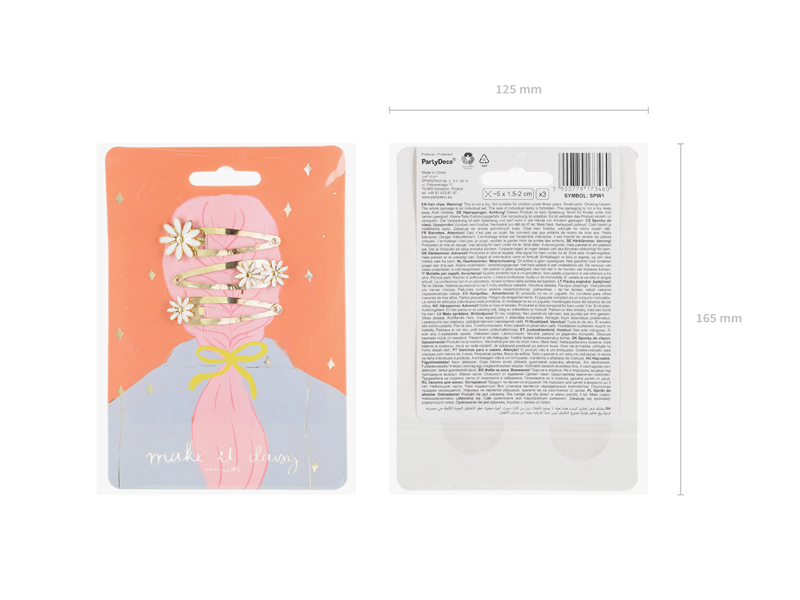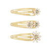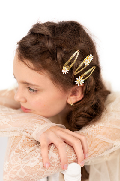 Spinki do włosów Stokrotki, metalowe spinki w kolorze złotym z białymi elementami, zestaw zawiera 3 elementy, wymiary ok. 5 x 1.5 – 2 cm. (1 op. / 3 szt.)