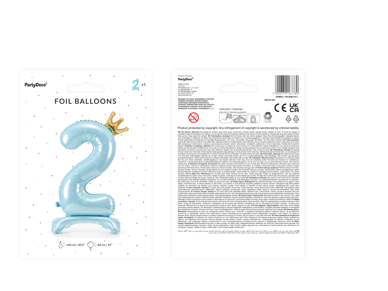 Stojący, metalizowany balon foliowy cyfra ”2” w kolorze błękitnym z koroną w kolorze złotym, rozmiar przed napompowaniem 103 cm (40.5”), rozmiar po napompowaniu 84 cm (33″’). Do napompowania powietrzem.
