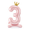 Stojący, metalizowany balon foliowy cyfra ”3” w kolorze jasnoróżowym z koroną w kolorze złotym, rozmiar przed napompowaniem 103 cm (40.5”), rozmiar po napompowaniu 84 cm (33”). Do napompowania powietrzem.