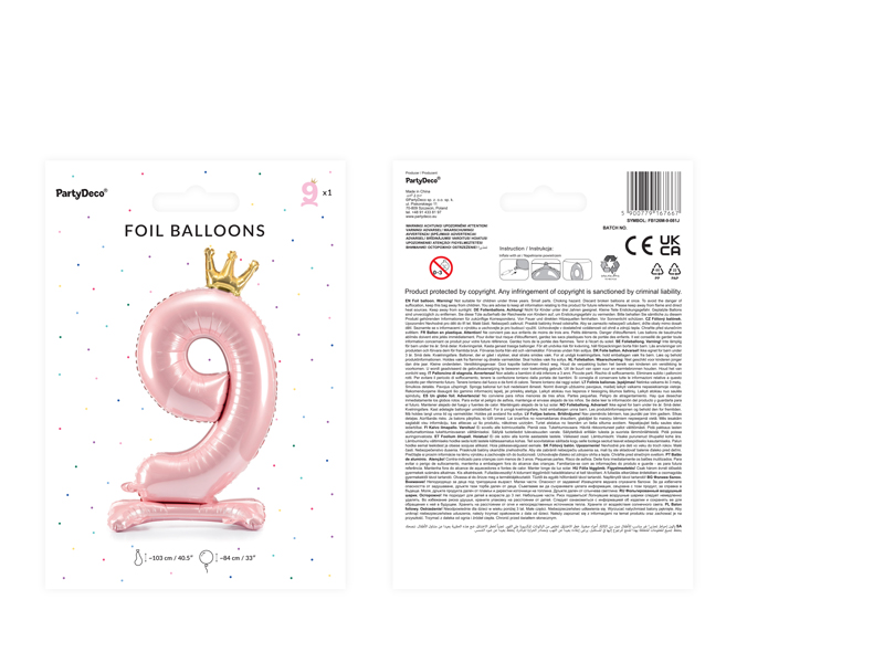 Stojący, metalizowany balon foliowy cyfra „9” w kolorze jasnoróżowym z koroną w kolorze złotym, rozmiar przed napompowaniem 103 cm (40.5”), rozmiar po napompowaniu 84 cm (33”). Do napompowania powietrzem.
