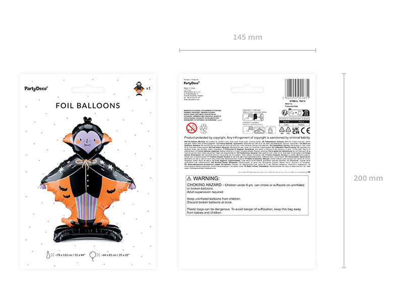 Stojący balon foliowy Dracula, mix kolorów. Wymiary przed napompowaniem 78 x 112 cm (31 x 44”), wymiary po napompowaniu 64 x 81 cm (25 x 32”). Do napompowania powietrzem. Zestaw zawiera słomkę.