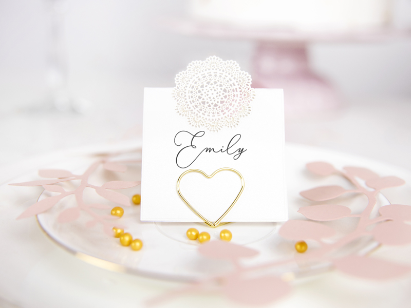Stojaki na winietki Serca w kolorze złotym, wysokość ok. 2,5 cm. (1 op. / 10 szt.)