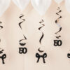 Czarne świderki urodzinowe. Zestaw zawiera 5 sztuk (2 x liczba 50, 3 x kokardka). Długość po rozwieszeniu około 50 cm. Świderki zakończone bezbarwnym haczykiem ułatwiającym mocowanie. (1 op. / 5 szt.)