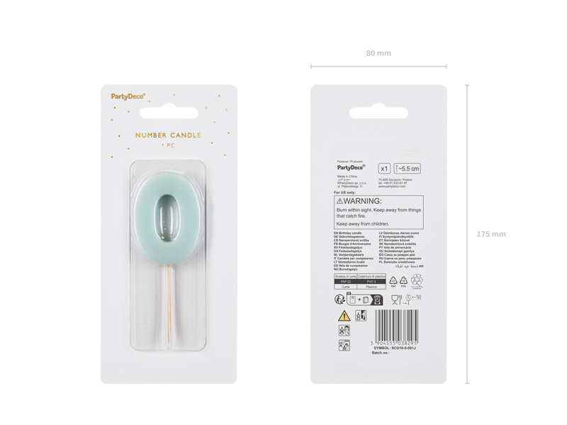 Świeczka urodzinowa Cyferka 0, w kolorze jasnoniebieskim, rozmiar ok. 5.5 cm.