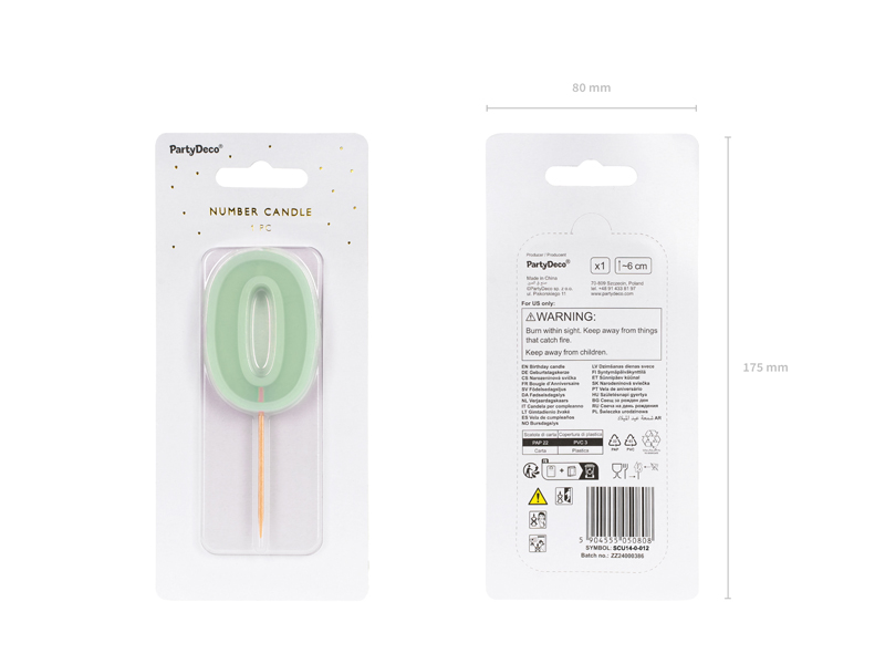 Świeczka urodzinowa Cyfra 0 w kolorze zielonym, Wysokość świeczki ok. 6 cm, wysokość świeczki z patyczkiem ok. 10 cm. Świeczka posiada drewniany patyczek.