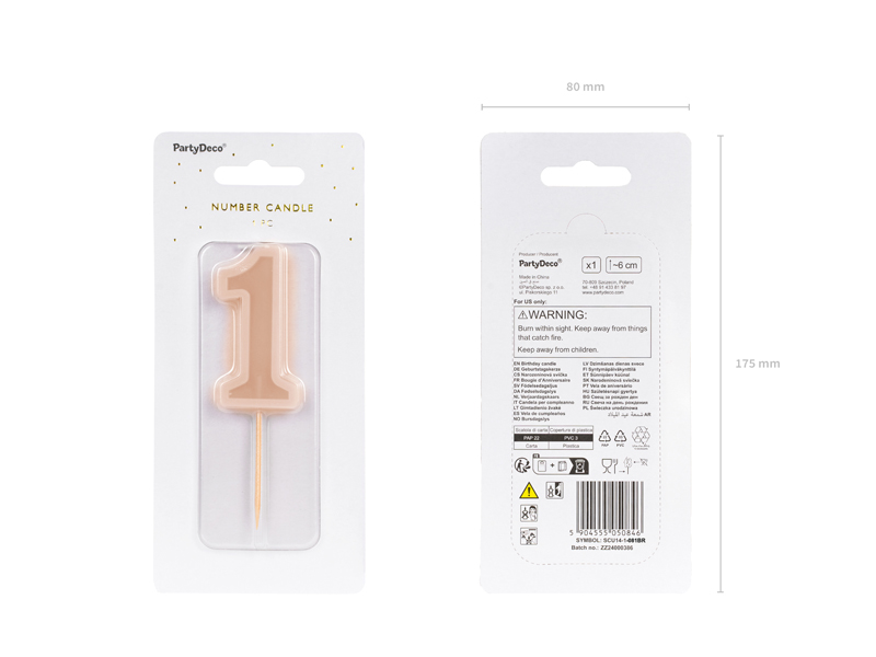 Świeczka urodzinowa Cyfra 1 w kolorze brudnego różu, Wysokość świeczki ok. 6 cm, wysokość świeczki z patyczkiem ok. 10 cm. Świeczka posiada drewniany patyczek.