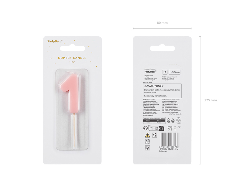Świeczka urodzinowa Cyferka 1, w kolorze jasnoróżowym, rozmiar ok. 5.5 cm.