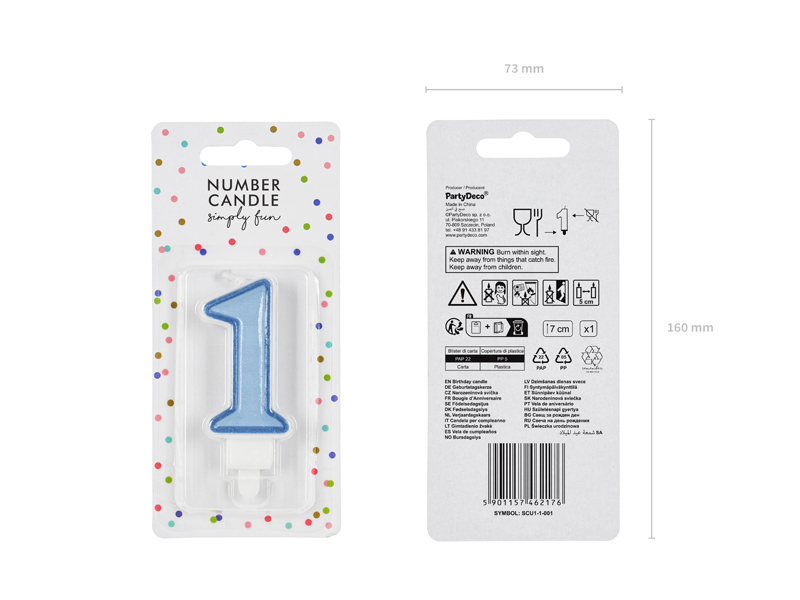 Świeczka urodzinowa Cyferka 1 w kolorze niebieskim, rozmiar 7 centymetrów.