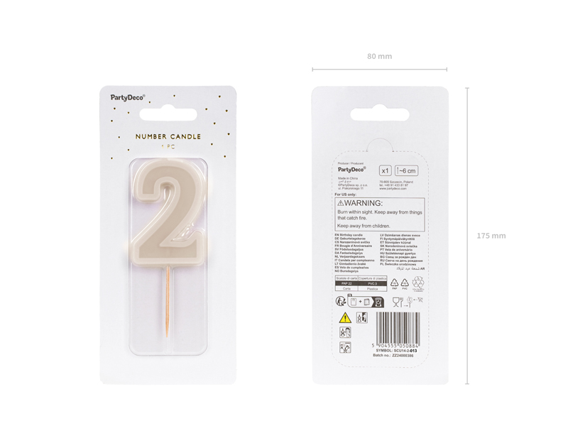 Świeczka urodzinowa Cyfra 2 w kolorze beżowym, Wysokość świeczki ok. 6 cm, wysokość świeczki z patyczkiem ok. 10 cm. Świeczka posiada drewniany patyczek.