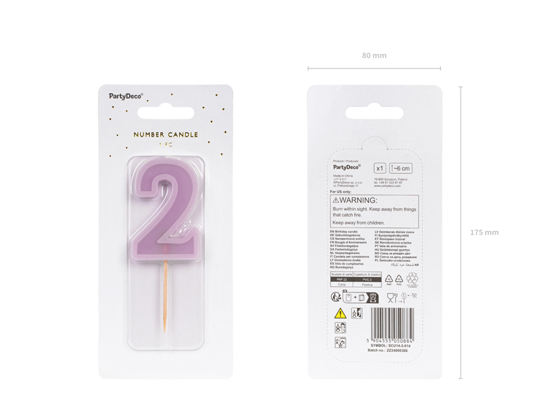 Świeczka urodzinowa Cyfra 2 w kolorze fioletowym, Wysokość świeczki ok. 6 cm, wysokość świeczki z patyczkiem ok. 10 cm. Świeczka posiada drewniany patyczek.