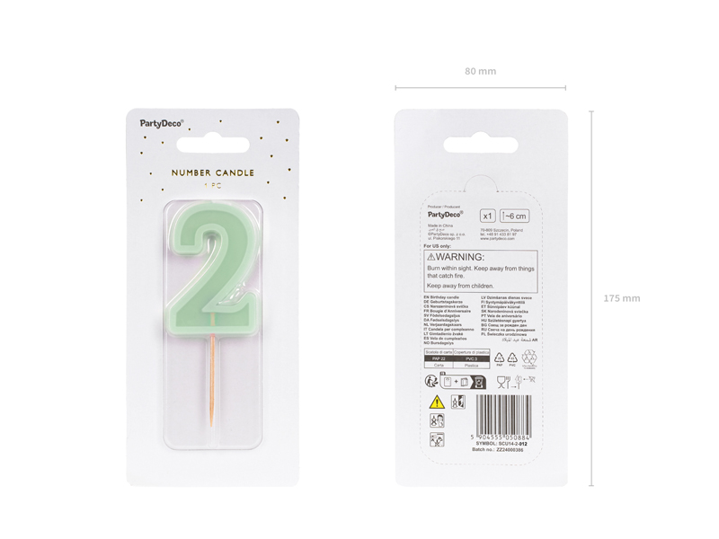 Świeczka urodzinowa Cyfra 2 w kolorze zielonym, Wysokość świeczki ok. 6 cm, wysokość świeczki z patyczkiem ok. 10 cm. Świeczka posiada drewniany patyczek.