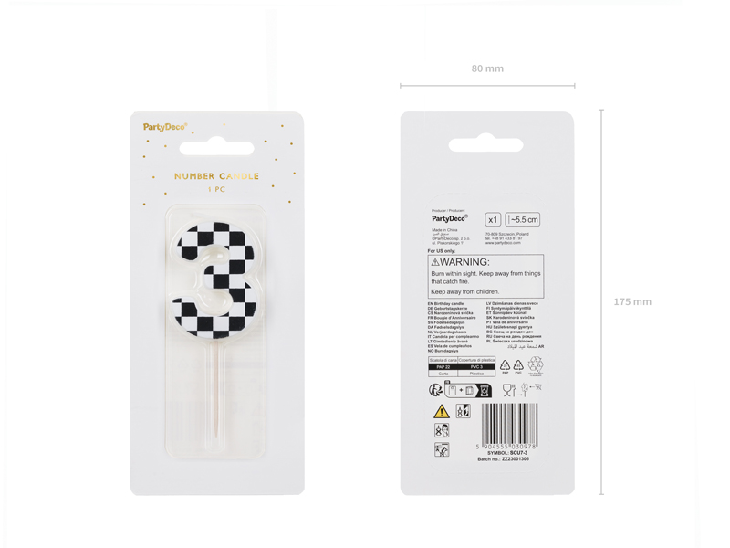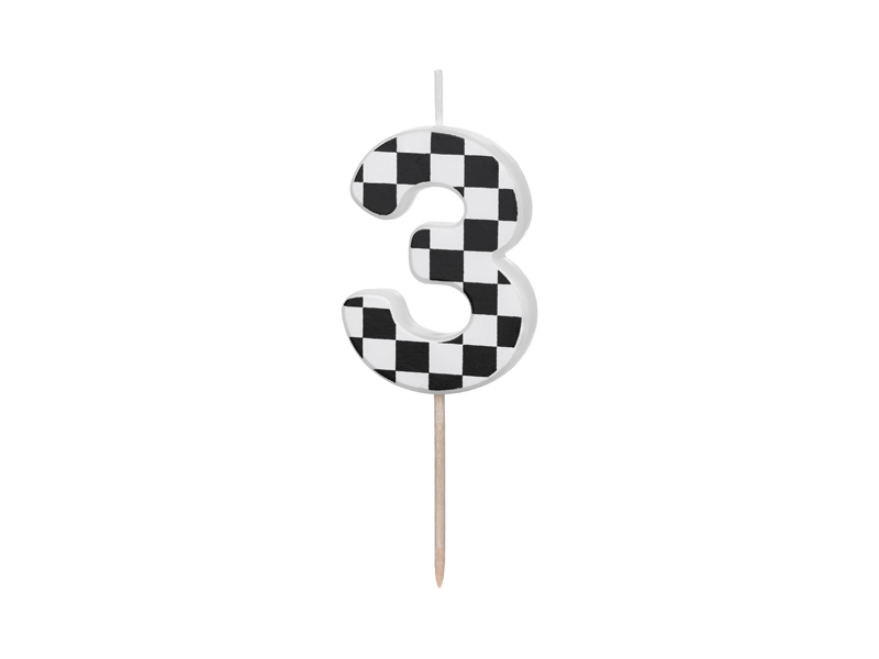 Świeczka urodzinowa Cyferka 3 ze wzorem szachownicy, rozmiar ok. 5.5 cm.