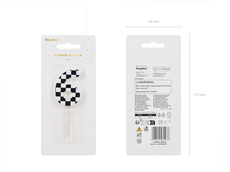 Świeczka urodzinowa Cyferka 6 ze wzorem szachownicy, rozmiar ok. 5.5 cm.