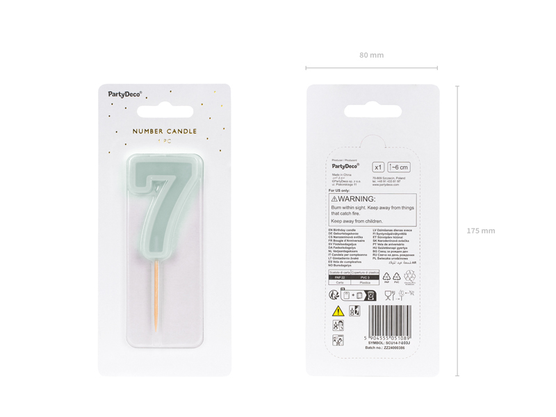 Świeczka urodzinowa Cyfra 7 w kolorze jasnomiętowym. Wysokość świeczki ok. 6 cm, wysokość świeczki z patyczkiem ok. 10 cm. Świeczka posiada drewniany patyczek.