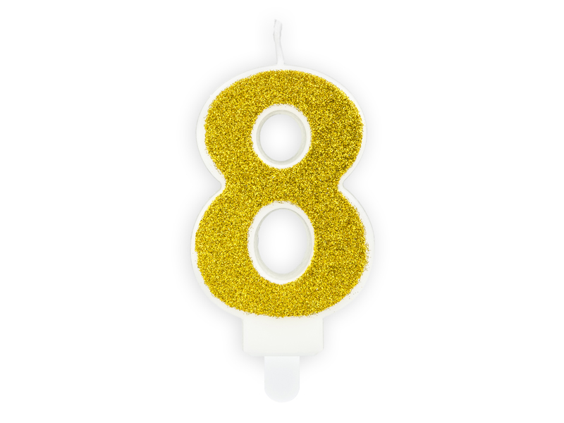 Świeczka urodzinowa Cyferka 8 w kolorze złotym brokatowym, rozmiar ok. 7 cm.
