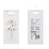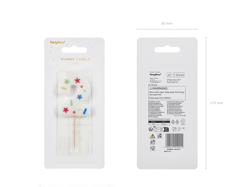 Świeczka urodzinowa Cyfra 2 w kolorze białym z konfetti na drewnianym patyczku, wysokość cyfry ok. 5.5 cm, wysokość całkowita ok. 10 cm.
