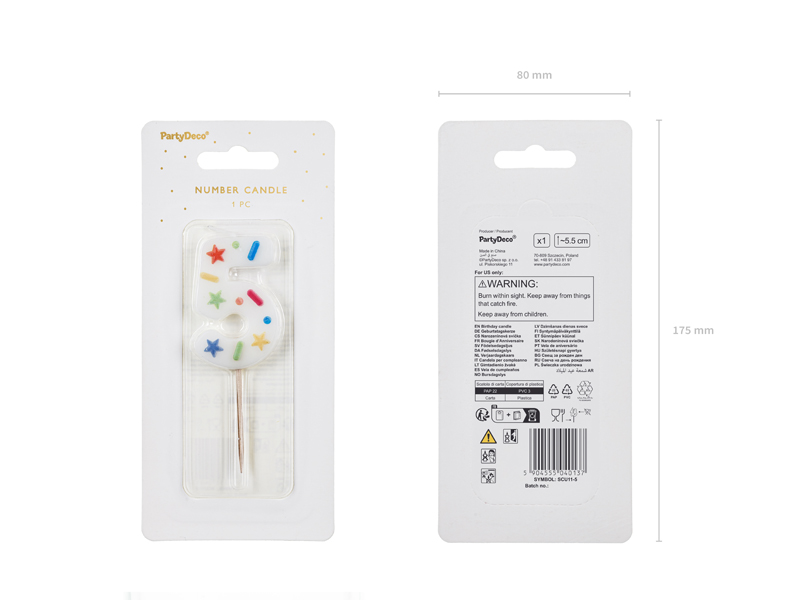 Świeczka urodzinowa Cyfra 5 w kolorze białym z konfetti na drewnianym patyczku, wysokość cyfry ok. 5.5 cm, wysokość całkowita ok. 10 cm.