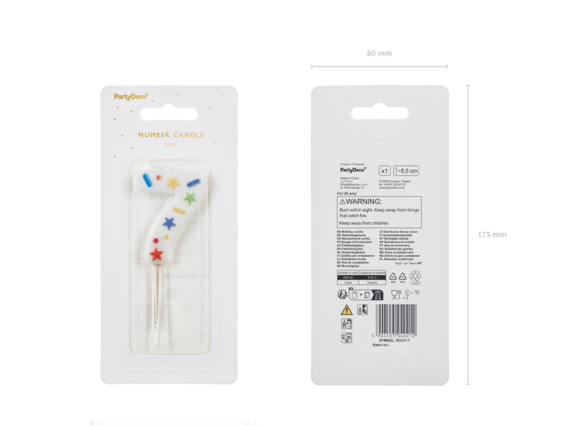 Świeczka urodzinowa Cyfra 7 w kolorze białym z konfetti na drewnianym patyczku, wysokość cyfry ok. 5.5 cm, wysokość całkowita ok. 10 cm.