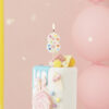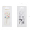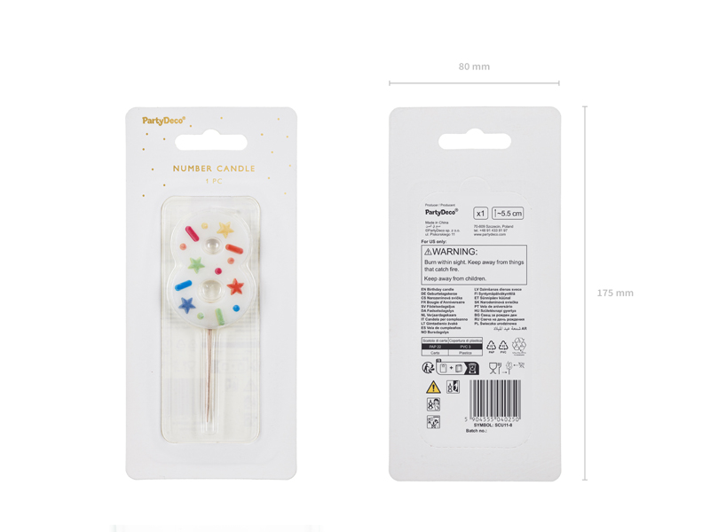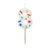 Świeczka urodzinowa Cyfra 8 w kolorze białym z konfetti na drewnianym patyczku, wysokość cyfry ok. 5.5 cm, wysokość całkowita ok. 10 cm.