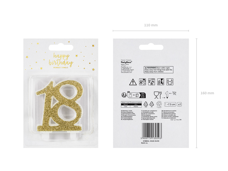 Świeczka urodzinowa liczba 18 w kolorze złotym brokatowym, rozmiar ok. 7.5 cm.