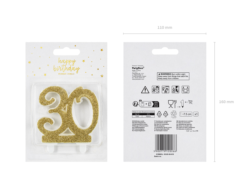 Świeczka urodzinowa liczba 30 w kolorze złotym brokatowym, rozmiar ok. 7.5 cm.
