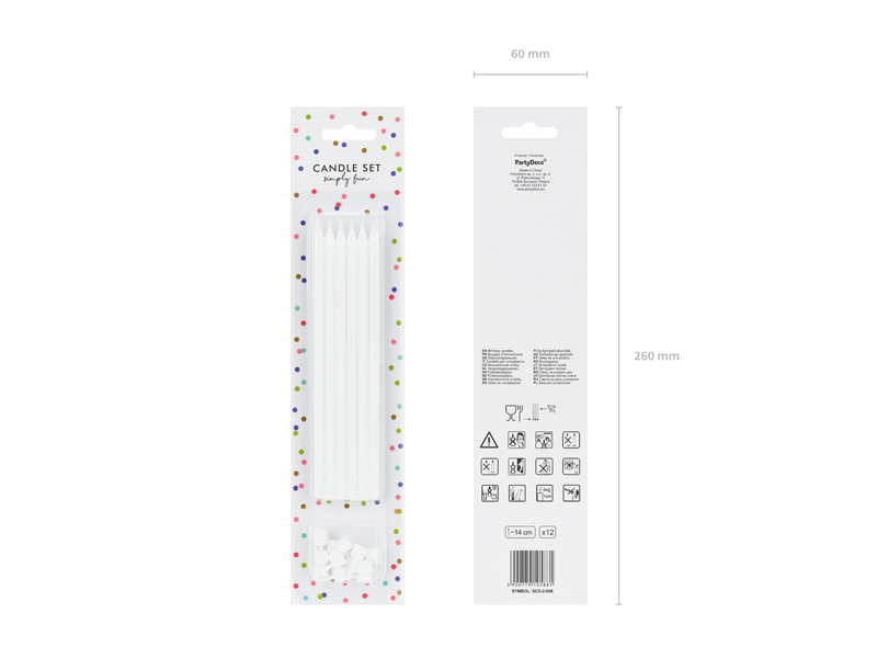 Świeczki urodzinowe gładkie w kolorze białym, wysokość ok. 14 cm. Zestaw zawiera 12 świeczek i podstawek. (1 op. / 12 szt.)