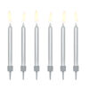Świeczki urodzinowe gładkie w kolorze srebrnym metalizowanym, rozmiar ok. 6 cm, w zestawie 6 świeczek i 6 podstawek. (1 op. / 6 szt.)