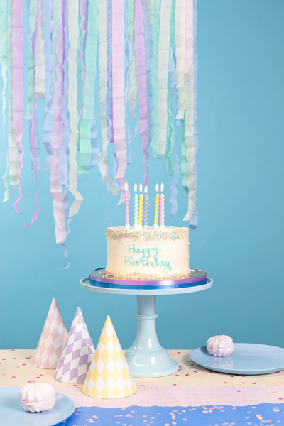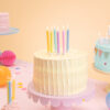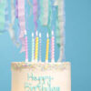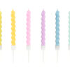 Świeczki urodzinowe zakręcone, mix 6 pastelowych kolorów (żółty, różowy, zielony, niebieski, pomarańczowy, fioletowy), wysokość ok. 8.5 cm. Zestaw zawiera świeczki i podstawki. (1 op. / 6 szt.)