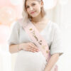 Szarfa wykonana z papieru w kolorze bladoróżowym ze złotym napisem „Mom to be”, szerokość ok. 9.5 cm, długość ok. 75 cm.