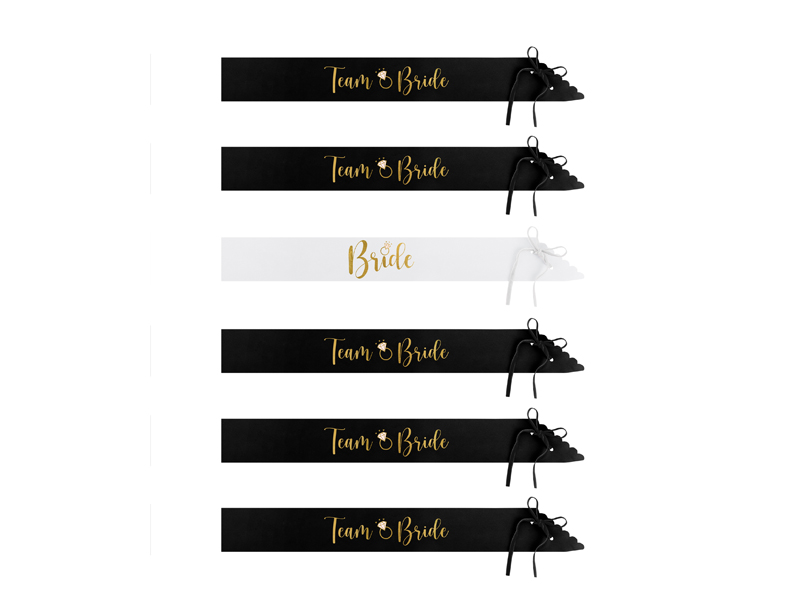 Zestaw szarf satynowych: 1 szt Bride to be w kolorze białym z metalicznym nadrukiem w kolorze złota, 5 szt szarf Team Bride w kolorze czarnym z metalicznym nadrukiem w kolorze złota szerokość ok. 10 cm, długość ok. 75 cm. (1 op. / 6 szt.)