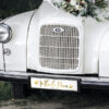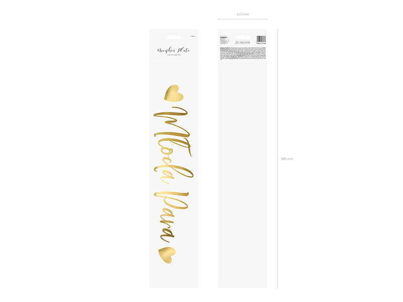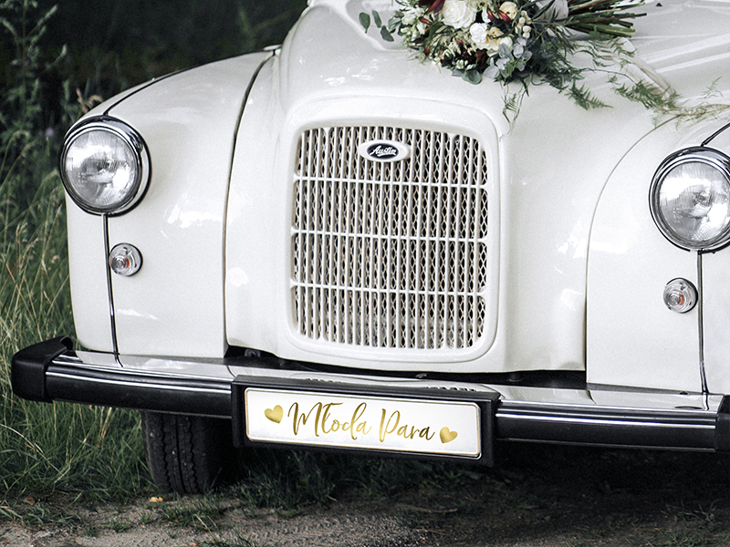 Tablica rejestracyjna w kolorze białym ze złotym lustrzanym napisem Młoda Para, szerokość ok. 52 cm, wysokość ok. 11,5 cm.