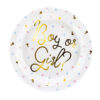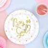 Talerzyki papierowe, mix kolorów ze złotym metalizowanym napisem Boy or Girl, średnica ok 23 cm. (1 op. / 6 szt.)