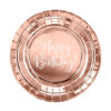 Talerzyki papierowe w kolorze różowego złota z białym napisem Happy Birthday!, średnica ok. 18 cm. (1 op. / 6 szt.)