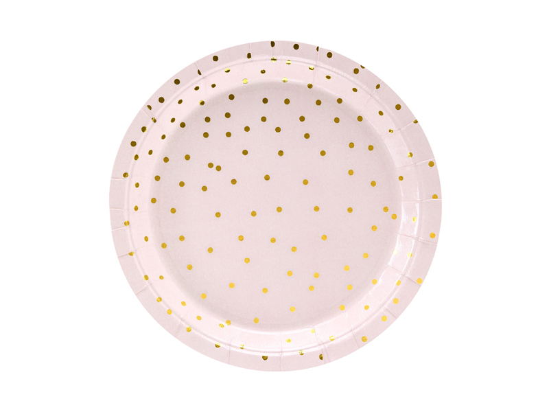 Talerzyki papierowe w kolorze jasnoróżowym ze złotym wzorem kropek, średnica ok. 18 cm. (1 op. / 6 szt.)