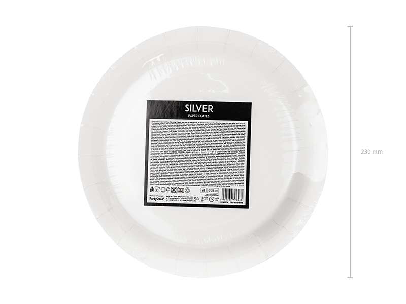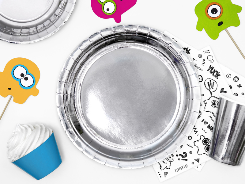 Talerzyki papierowe okrągłe w kolorze srebrnym, średnica ok. 23 cm (1 op. / 6 szt.)